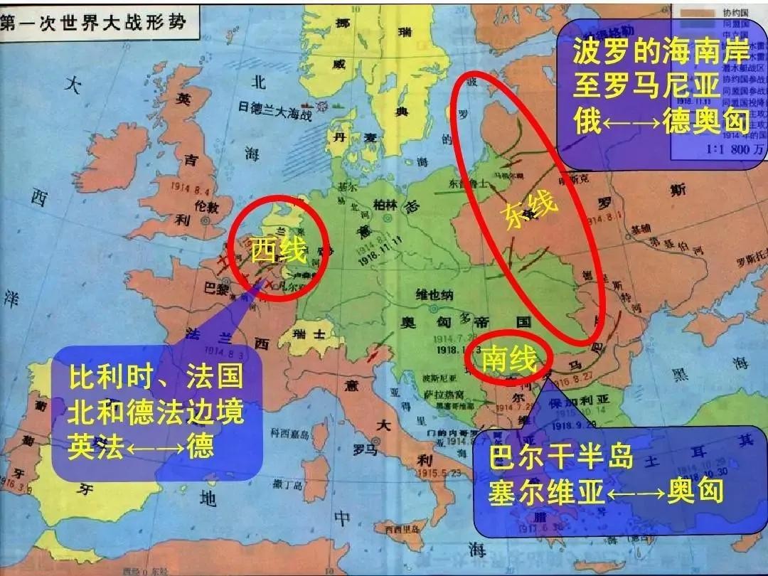 1914年7月28日,奥匈帝国在德国的支持下,以萨拉热窝事件为借口,向塞尔维亚宣战。接着德、俄、法、英等国相继投入战争,第一次世界大战爆发。交战的一方为同盟国的德意志帝国和奥匈帝国,以及支持他们的奥斯曼帝国、保加利亚。另一方为协约国的英国、法国和俄罗斯帝国以及支持它们的塞尔维亚、比利时、意大利、日本等国。