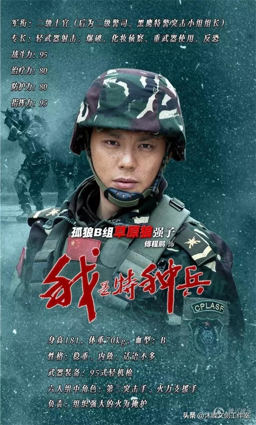 中国职业特种兵、特警身高181cm角色设定恶狼强晓伟,第二突击手兼火力支援手出生地北京体重70kg拥有武器95式轻机枪别名强子恶狼能力(招术)轻武器射击,爆破,化妆侦察,重武器使用,反恐军衔二级士官(后为二级警司,原黑鹰特警突击小组组长)性格稳重、内敛、话语不多负责组织强大的火力掩护所属作品《我是特种兵》饰演傅浤鸣