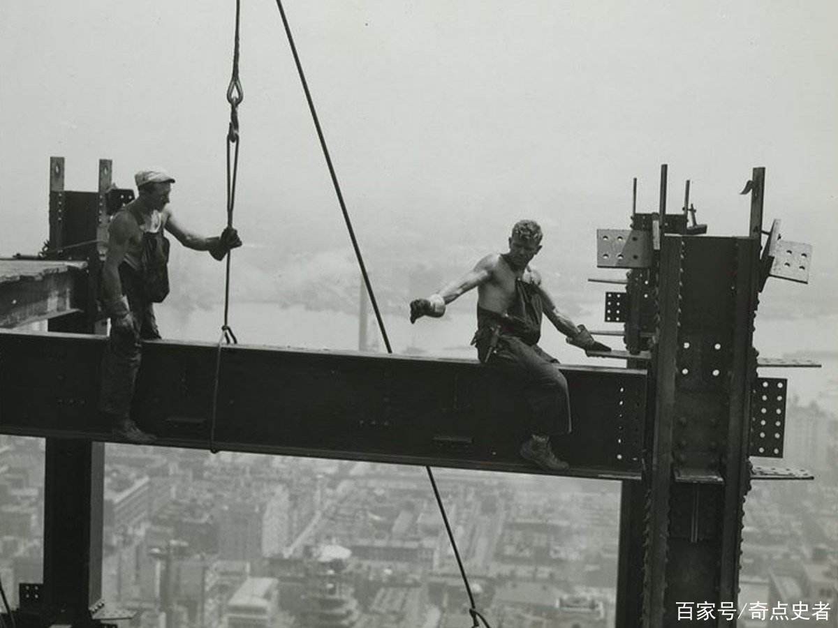 1930年代,帝国大厦,当时的世界第一高楼,那时候没有计算机、设计师全靠手算。连安全帽、安全绳都没有,工人直接裸奔着干,103层,410天干完。