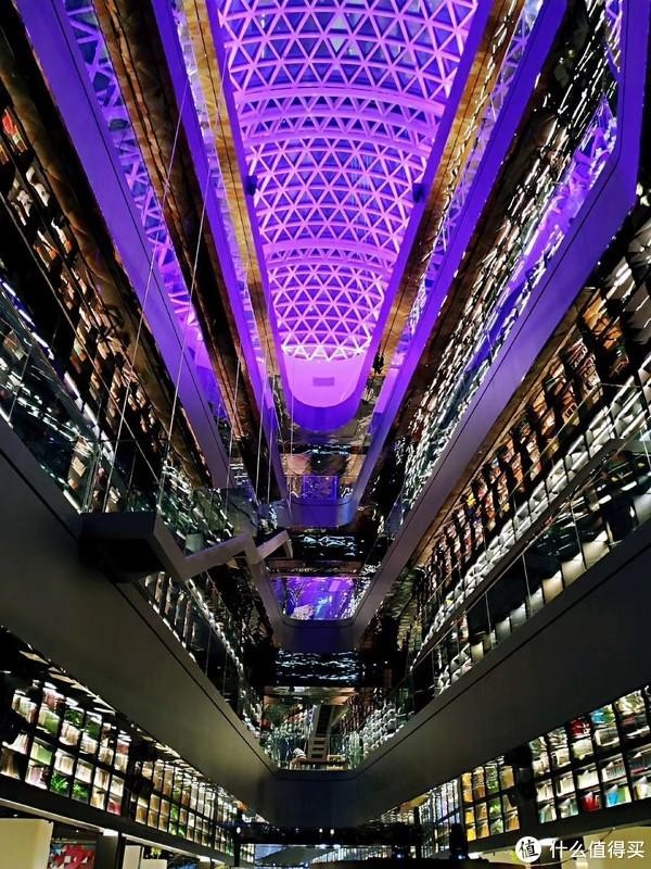顶楼的灯光变幻,整个书店的书墙也会给人不一样的感觉,非常壮观。