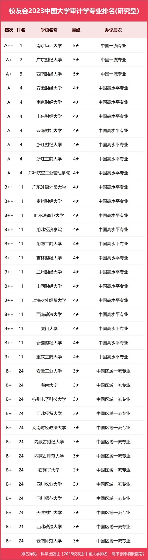 下面是校友会2023中国大学审计学专业排名: