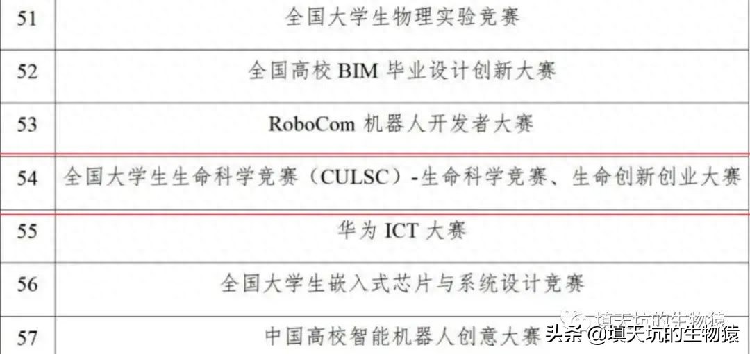 2021年3月22日,中国高等教育学会高校竞赛评估与管理体系研究工作组发布2020全国普通高校大学生竞赛排行榜。其中,与生命科学有关的竞赛—全国大学生生命科学竞赛榜上有名。这次入榜说明该赛事得到了更多的认可和越来越多人参与,同时也预示着该赛事将越来越规范化和严格(ps:竞争越来越大,获奖难度逐渐提升)。