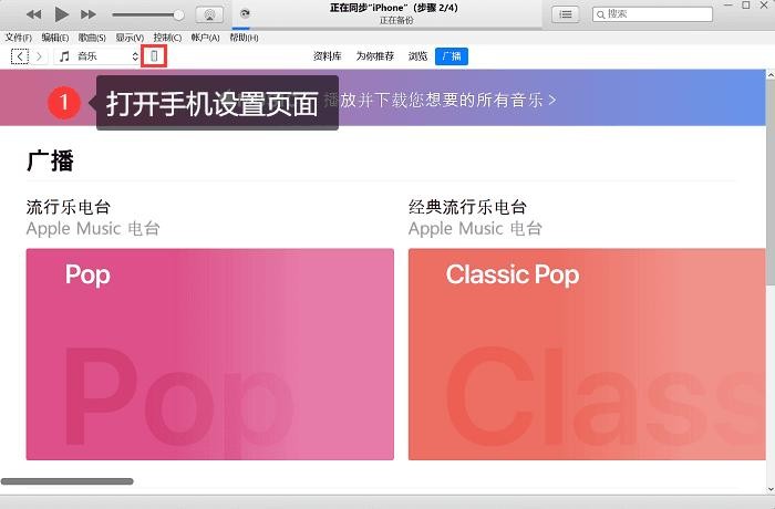 第一步:在电脑上打开iTunes工具,登录Apple ID后点击左上角的【手机图标】。