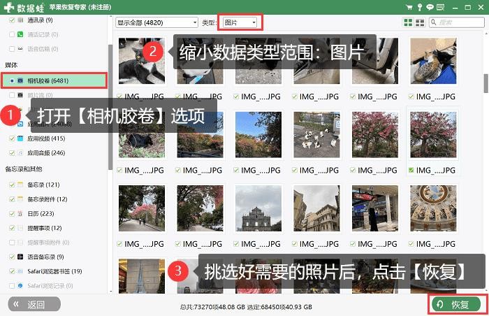 第二步:打开【相机胶卷】选项,选择数据类型为图片,挑选完需要恢复的照片后单击【恢复】,返回相册就能看到之前被删除的照片了。