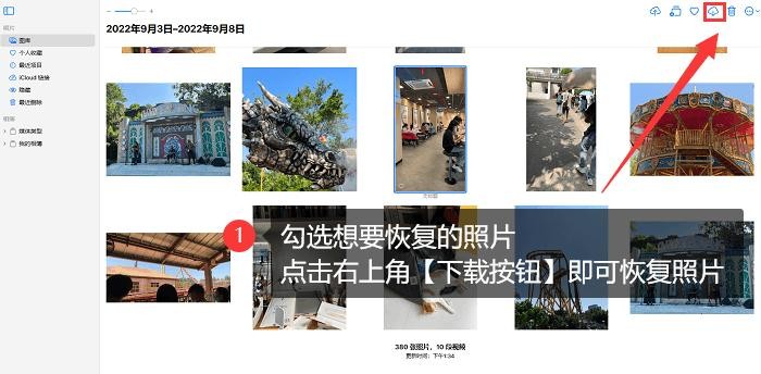 第三步:挑选想要恢复的照片,然后点击右上角的【下载按钮】就可以了,也可以选中照片后右键保存(按住Ctrl键可批量选择照片)。