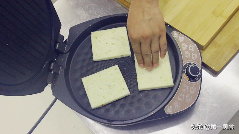 第三步:加热—把切好的面包片,放入烧热的电饼铛中加热一下,家里有微波炉的也可以放微波炉中,用高火加热3秒钟即可,让面包片更加柔软,这样我们做紫薯卷的时候更容易操作,面包片不易断。注意:加热时间不用过长,每面3-5秒即可~