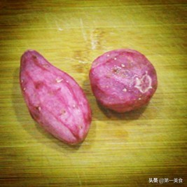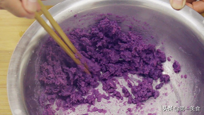 第一步:紫薯泥—我们准备削过皮的小紫薯两个,切成均匀薄片,放入蒸笼中,水烧开以后,上笼蒸20分钟,切的越薄蒸制的时间越短,20分钟以后关火,紫薯已经蒸熟,用筷子轻轻一拨就碎,把紫薯倒在盆中,加入白糖50克,炼乳10克,炼乳超市都有卖,很容易买到,多搅拌一会,化开白糖,把紫薯搅成细腻的紫薯泥备用。注意:紫薯现在和红薯一样也是收获的季节,大人小孩都可以多吃~