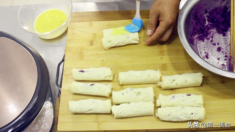 第四步:裹卷—在面包片上方抹上紫薯泥,下方涂上蛋液,蛋液能增加粘性,不易松散,涂好之后卷起来,在紫薯卷的两端先蘸上蛋液,再裹一层白芝麻。注意:蘸鸡蛋液的时候,阿飞为了做出的成品美观,没有蘸太多,蘸了约整个紫薯卷的1/4,大家自己做的时候,蘸多蘸少,大家自己控制量即可,不会影响口感~