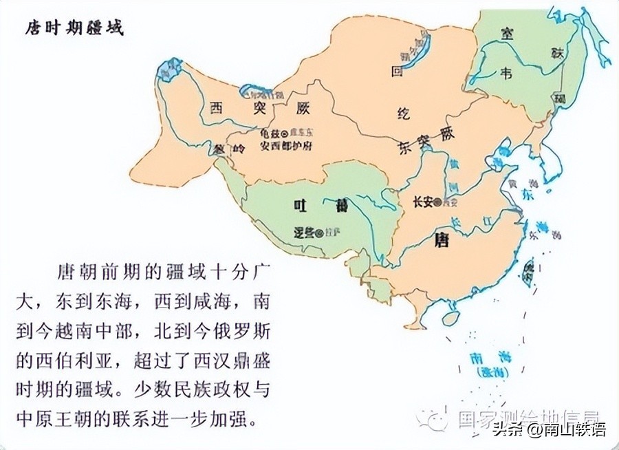 唐朝前期的疆域十分广大,东到东海,西到咸海,南到今越南中部,北到今俄罗斯的西伯利亚,超过了西汉鼎盛时期的疆域。少数民族政权与中原王朝的联系进一步加强。