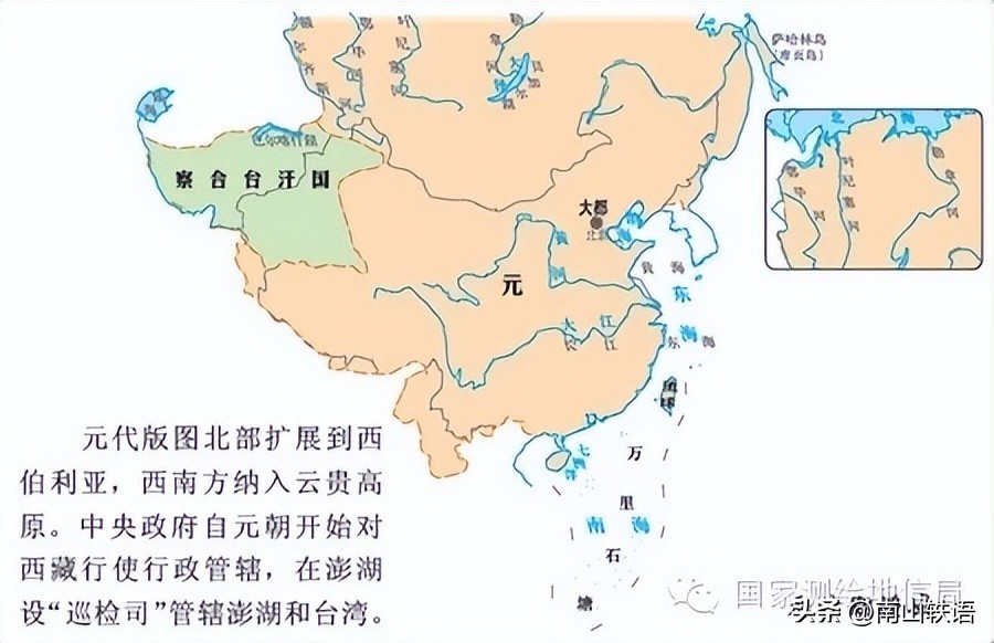 元代版图北部扩展到西伯利亚,西南方纳入云贵高原。中央政府自元朝开始对西藏行使行政管辖,在澎湖设“巡检司”管辖澎湖和台湾。