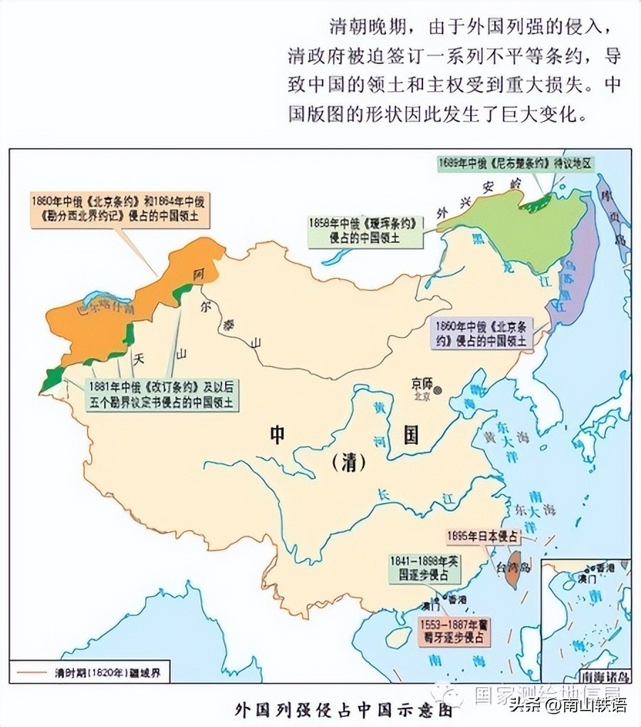 清朝晚期,由于外国列强的侵入,清政府被迫签订一系列不平等条约,导致中国的领土和主权受到重大损失。中国版图的形状因此发生了巨大变化。