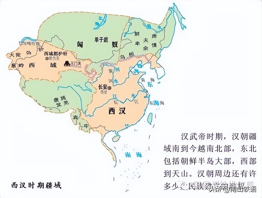 汉武帝时期,汉朝疆域南到今越南北部,东北包括朝鲜半岛大部,西部到天山。汉朝周边还有许多少数民族建立的政权。