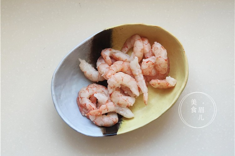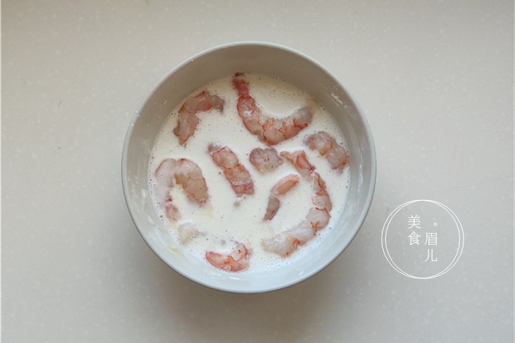 1、我用的成品虾仁,鲜虾的话要去壳去头部去虾线 ,将虾仁清洗干净, 略攥一下水分,加少许白胡椒粉和料酒、适量盐搅拌均匀腌制一会。