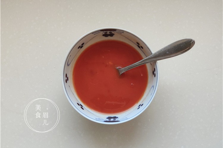 3、按照“54321”的口诀,来调制糖醋汁,在碗中放入5汤匙清水、4汤匙番茄酱、3汤匙白糖、2汤匙白醋、1汤匙淀粉,然后搅拌均匀。这是一个比例,如果菜量比较大的话,按照比例增加即可。