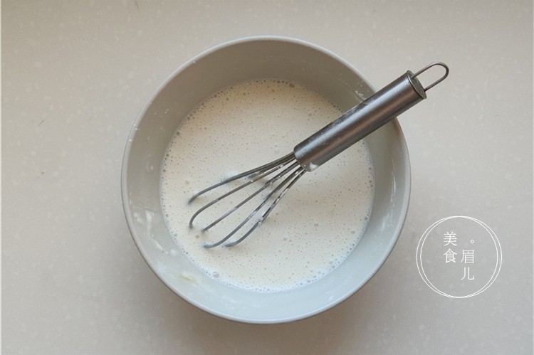 2、1个鸡蛋清磕入碗中,加入适量红薯淀粉和面粉(比例为2:1),再分次加入一些清水,将面糊搅拌均匀,提起打蛋器呈可以流动略粘稠的面糊状。