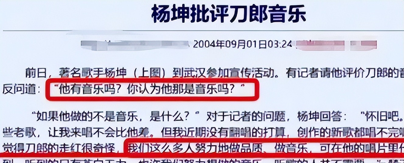在2004年的时候,一位记者采访杨坤时问他对刀郎的音乐有什么看法,结果杨坤张口就反问:“他有音乐吗?你认为他那是音乐吗?”