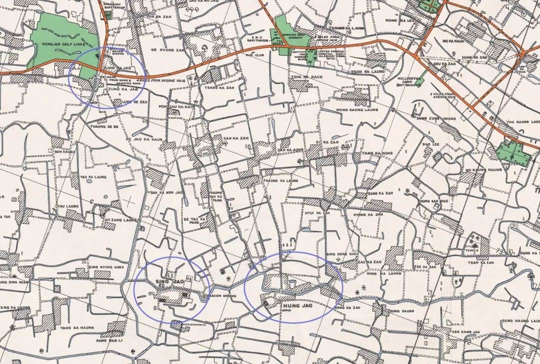 1935年上海英文地图中标注的“虹桥(HUNG JAO)”“新桥(SING JAO)”“程家桥(ZUNG KA JAO)”等地名。还有左上角的虹桥高尔夫球场也就是现今上海动物园位置。这幅地图中很多地名的英语标注都是沿用沪语发音