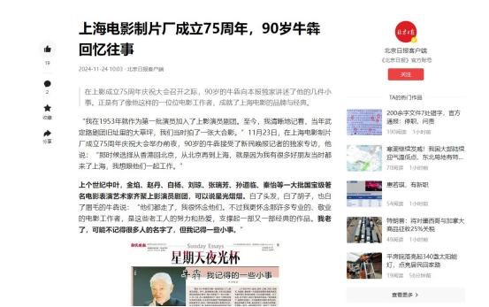 北京日报客户端(上海电影制片厂成立75周年,90岁牛犇回忆往事 2024.11.24)