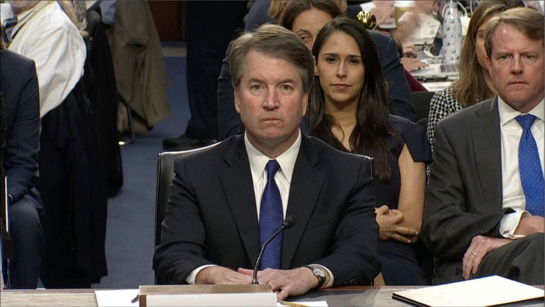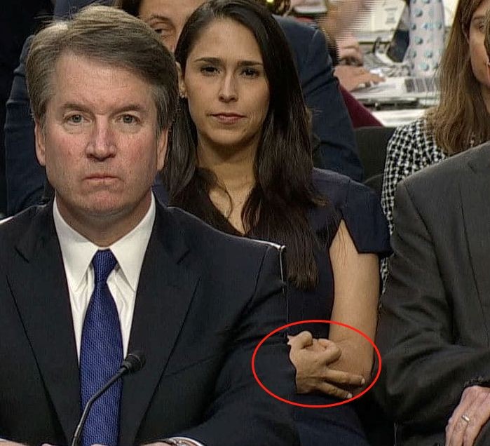 它来自去年美国最高法院大法官Brett Kavanaugh的一场听证会,背后是他坐在旁听席的一个女下属,Zina Bash。