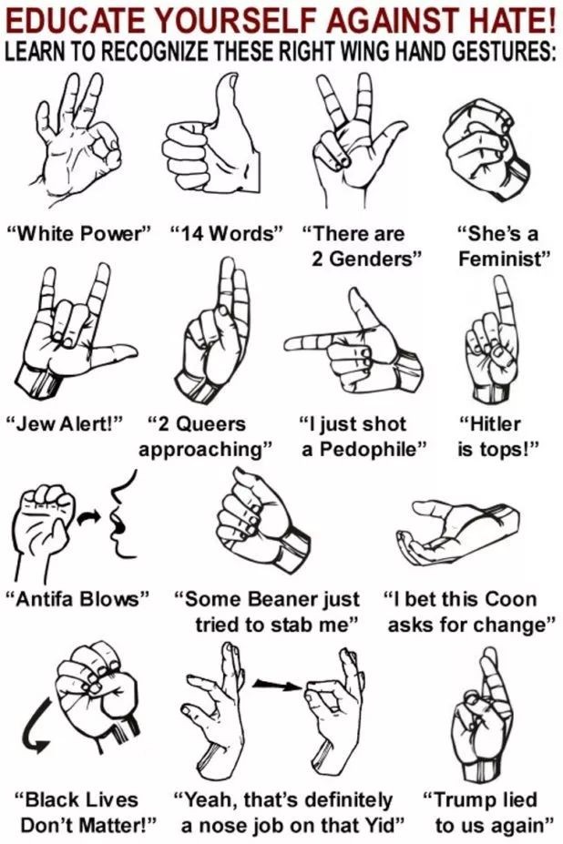 当左派试图把这些符号指出来时,极端分子总是会说,“这些那么好骗的‘正义护卫者’们现在认为,连OK手势也是种族主义的。有什么他们(不)认为是种族主义的吗?”