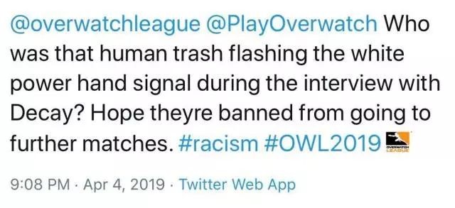 今年4月,《守望先锋》联赛洛杉矶角斗士队的选手在接受赛后采访时,一位观众在身后伸出一个「OK」手势,同样遭到猛烈攻击。