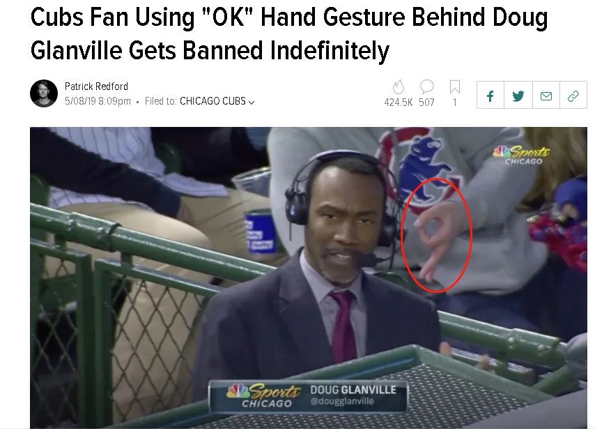 今年5月,美国一位棒球球迷,在NBC电视台的一位黑人主播身边做出了一个「OK」的手势,而被他所支持的“芝加哥小熊队”永久禁止观赛。声明中,“芝加哥小熊队”表示这位球迷做出的这个「OK」手势是与“种族主义”有关联的,“这样愚昧无知又令人反感的行为在球场上绝不被允许,任何这么做的人都不仅会被赶出球场,而且会被永远禁止进入球场。”