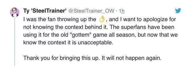 之后这名打出「OK」手势的网友出来道歉,解释说自己并不知道这个手势的含义,只是因为兴奋才做了这个动作,并且保证以后不会再用这个手势。