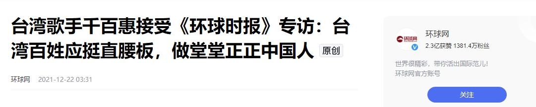环球网——台湾歌手千百惠接受《环球时报》专访:台湾百姓应挺直腰板,做堂堂正正中国人