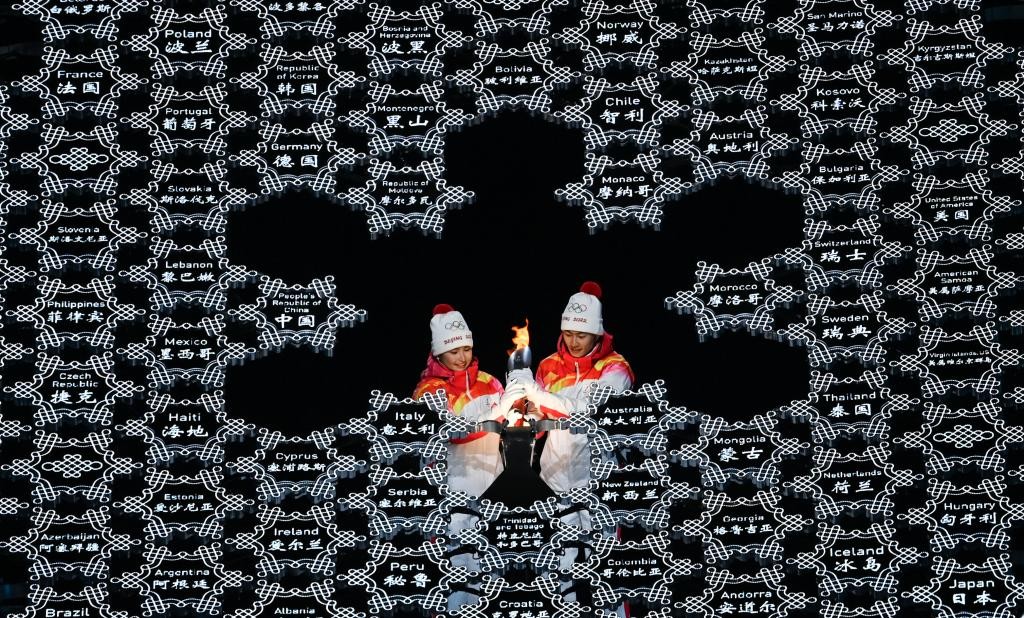 2022年2月4日,北京冬奥会最后一棒火炬手迪妮格尔·衣拉木江(左)和赵嘉文将火炬嵌入“大雪花”中央。新华社记者 李尕 摄