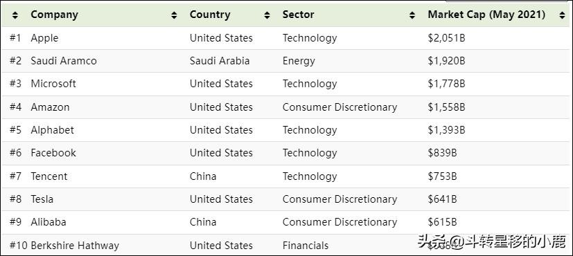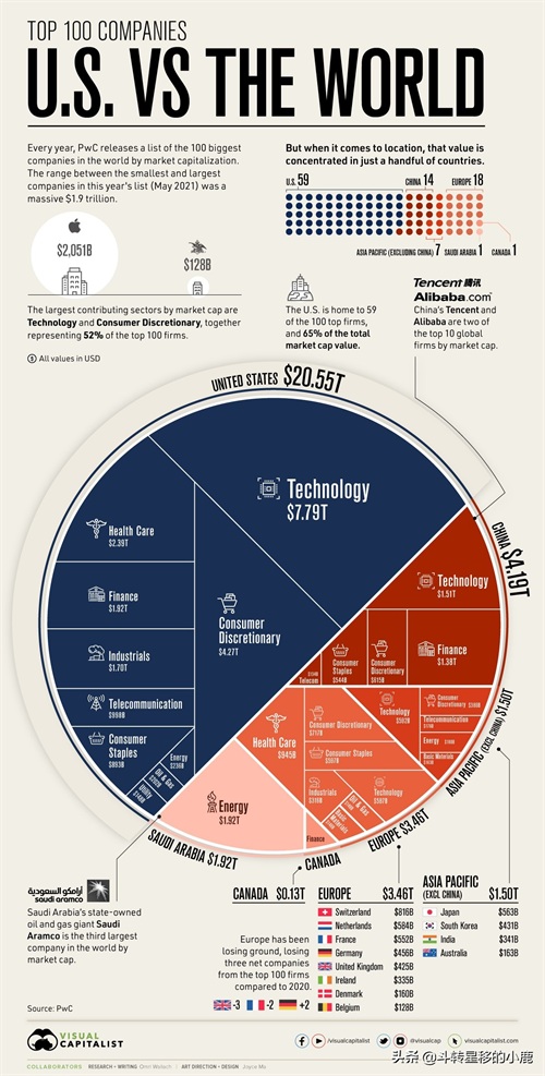 世界 100 强企业是如何叠加的?此可视化来自普华永道全球最大公司的年度排名,使用的是 2021 年 5 月的市值数据。