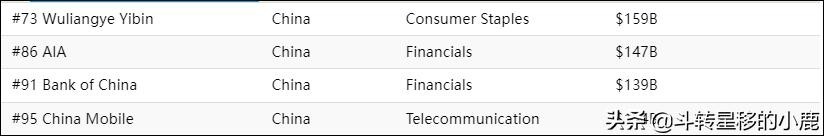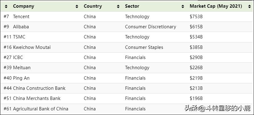 中国有 14 家公司进入世界 100 强,占全球 100 强总市值的 4.19 万亿美元或 13%。其中包括市值排名前 10 的公司中的两家,腾讯和阿里巴巴。