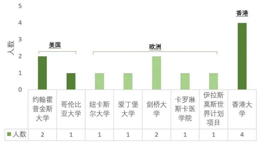 据最新QS世界大学排名,学院2022届本科毕业生进入世界前100名大学的毕业本科生共11人,占国(境)外深造人数的84.6%。其中去往美国、欧洲和香港的人数分别为3人、6人和4人,留学深造的高校质量越来越高,其中约翰霍普金斯大学、剑桥大学和卡罗琳斯卡医学院医学水平均国际排名前十。