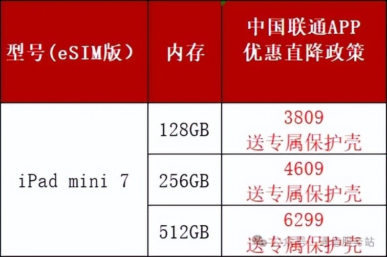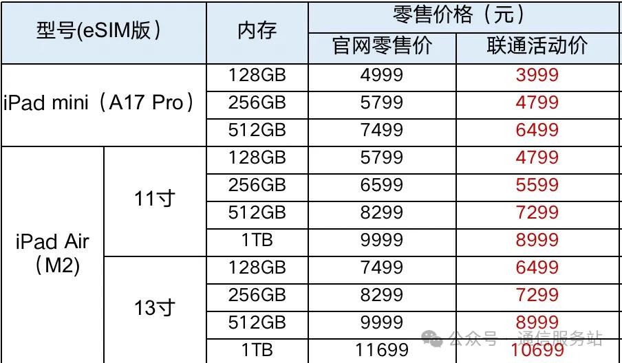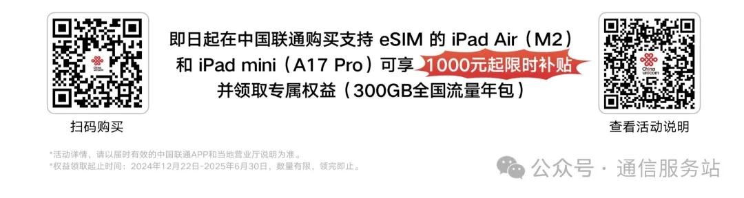 此次独家销售,联通更是给足了诚意,eSIM版iPad mini(A17 Pro) 和eSIM版iPad Air(M2) 两款活动机型都是直接补贴1000元,与苹果官方的WiFi版同价了,还送一年300G全国流量,如此一来,买个带5G功能(也支持WiFi)的iPad可比只有WiFi功能的要划算的多。
