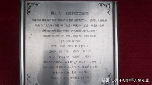 刚步入公园,马上让人注意到的是一辆老式的,看上去历史非常厚重的黑色轿车,这就是蒋夫人宋美龄的座驾。该车为美国通用汽车公司定制的凯迪拉克防弹车,四门7座加长版,长6.447米,宽1.912米,高1.441米,重达3.4吨,是宋美龄于1988年始直到去世,在国内的专属座驾。蒋介石于1975年4月5日病逝后,宋美龄赴美国幽居。此后,宋美龄曾三度回台湾,都居住在士林官邸。