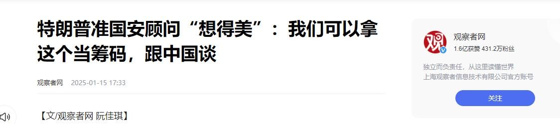 信息来源:观察者网于2025年1月15日发布的——《特朗普准国安顾问“想得美”:我们可以拿这个当筹码,跟中国谈》