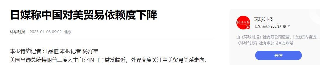 信息来源:环球时报于2025年1月3日发布的——《日媒称中国对美贸易依赖度下降》