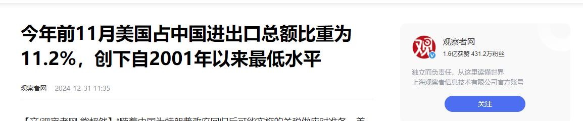信息来源:观察者网于2024年12月31日发布的——《今年前11月美国占中国进出口总额比重为11.2%,创下自2001年以来最低水平》