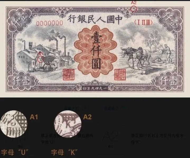 空心五角星水印票面底纹由“中国人民银行”、“壹仟圆”、“1000”组成本券冠字、号码与其他一版币相反,为左号码,右冠字。东北银行工业处制作的版多在年份后加一个“印”字,其他关内制版的票券,除了拾元工农“中华民国三十八年印”外,都没有这种现象。暗记如下