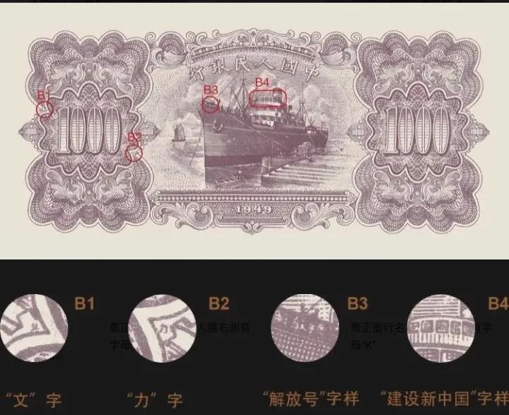 B2:票券背面左侧1000右下角(如图)中有汉字“力”字暗记;