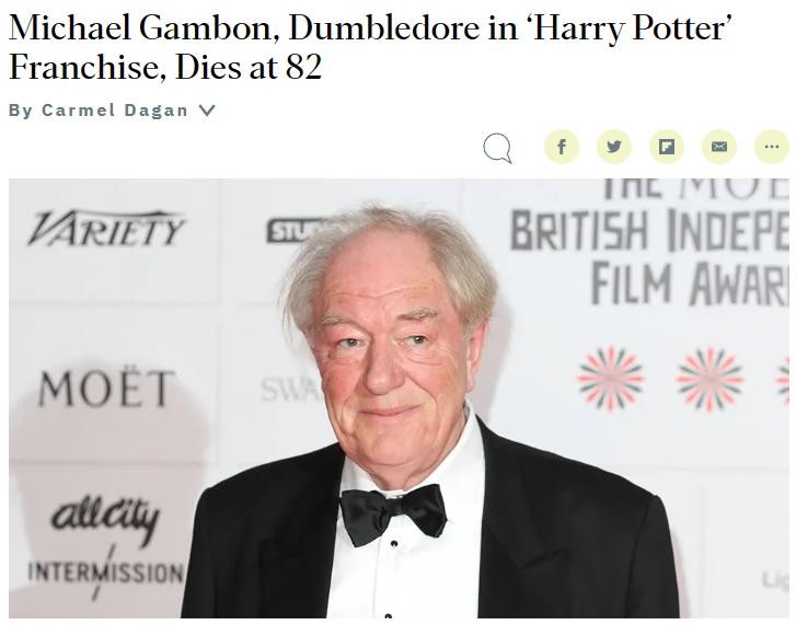 9月28日,英国爱尔兰著名演员迈克尔·甘本(Michael Gambon)因肺炎辞世,享年82岁。
