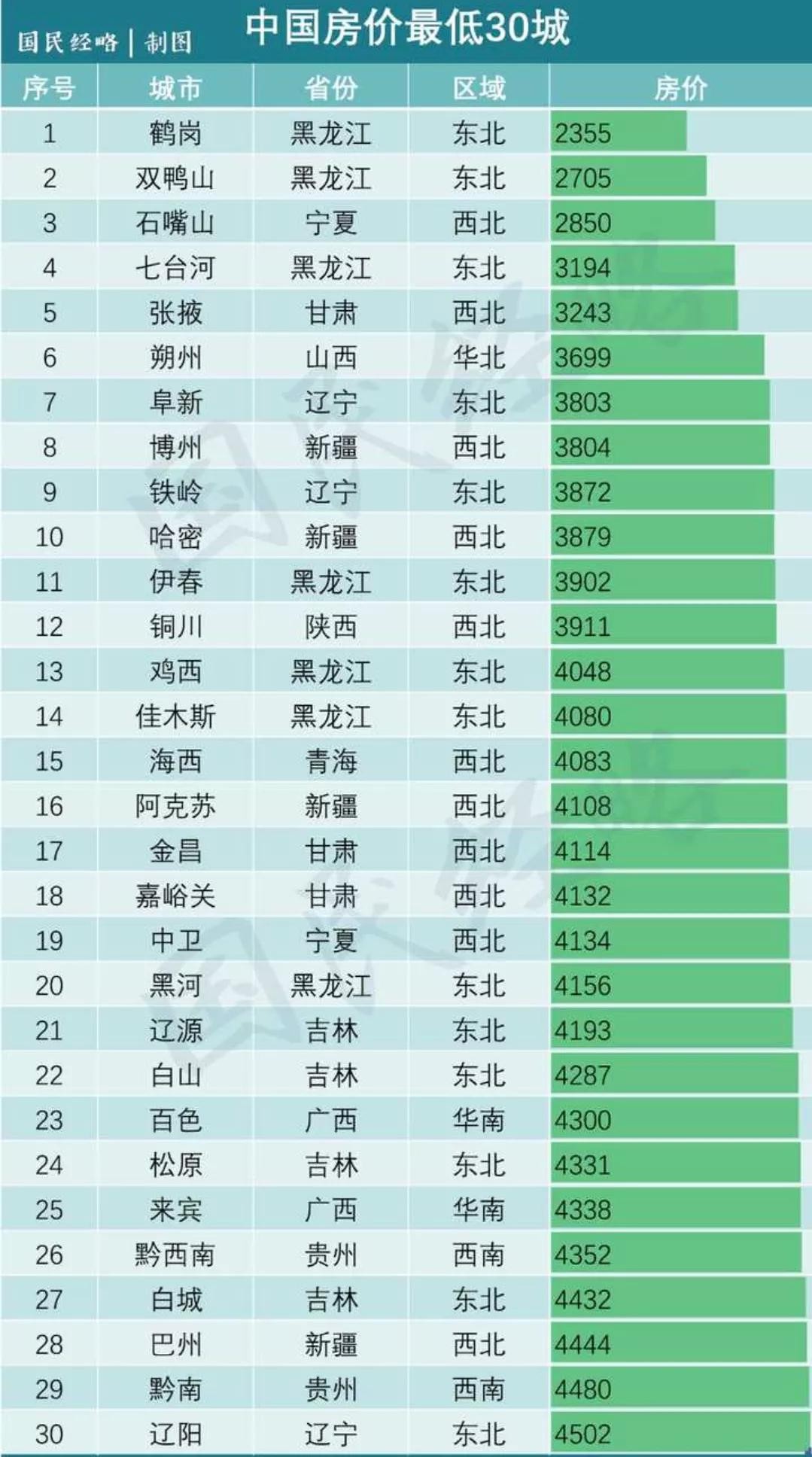 全国房价最低的十个城市分别是:鹤岗、双鸭山、石嘴山、七台河、张掖、朔州、阜新、博州、铁岭和哈密。