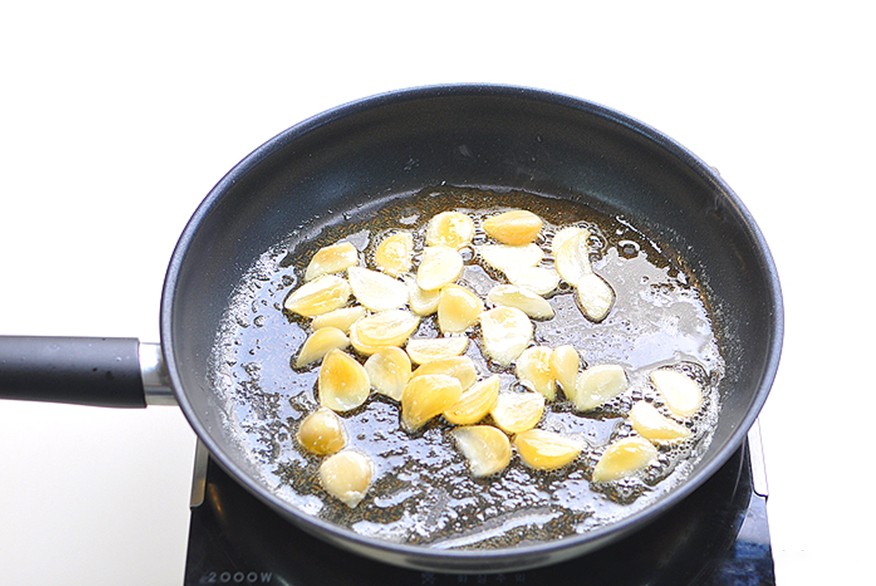 4. 倒入切好的蒜片进行炒香;