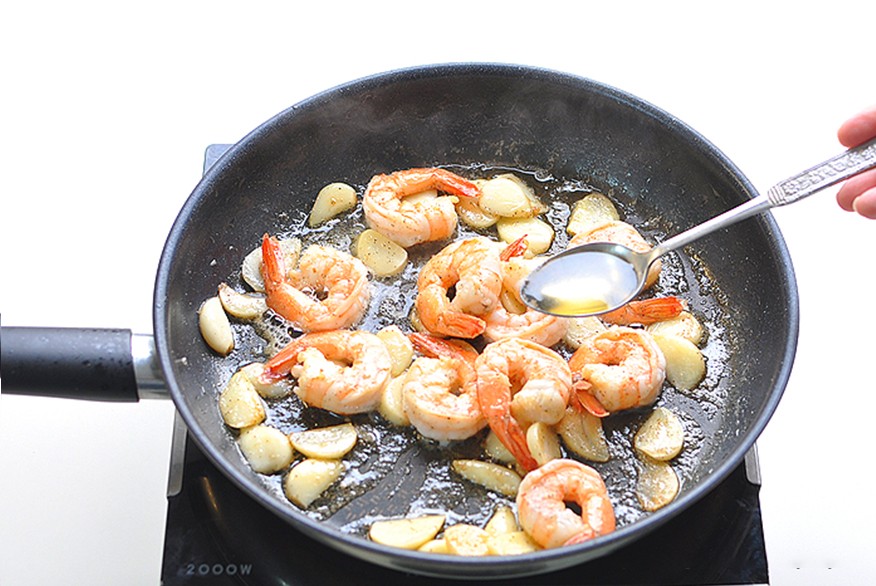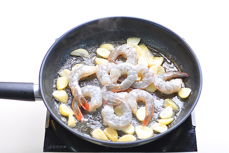 5. 随后加入准备好的冷冻虾,再次进行翻炒;