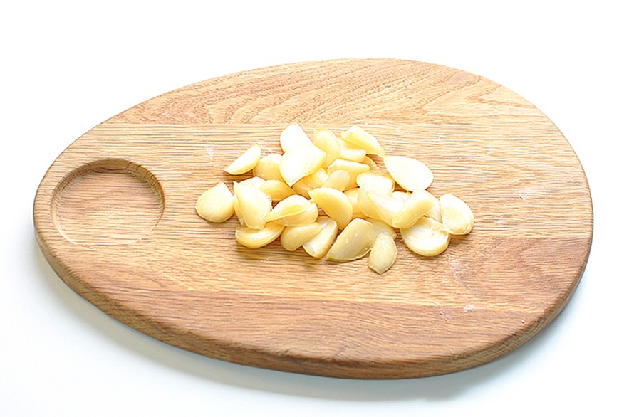2. 将蒜瓣切成片,放置一边备用;