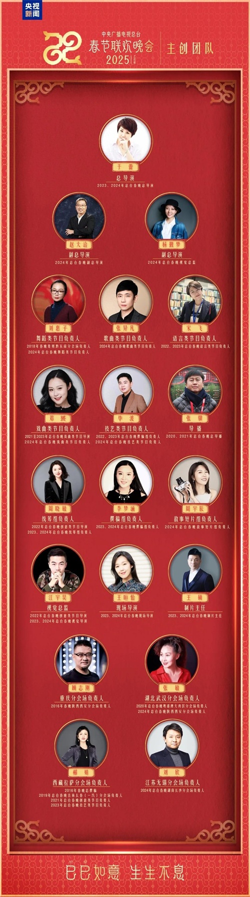 中央广播电视总台《2025年春节联欢晚会》正在紧锣密鼓筹备中。经上级部门批准,12月29日,春晚主创团队官宣:总导演于蕾,副总导演赵大治、杨觐梦,及刘惠子、张异凡、宋飞、邓赟、毕波、张骥、顾志刚、张敏、郝婧、刘欣等共同组成主创团队,全力推进2025年春晚创作。