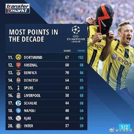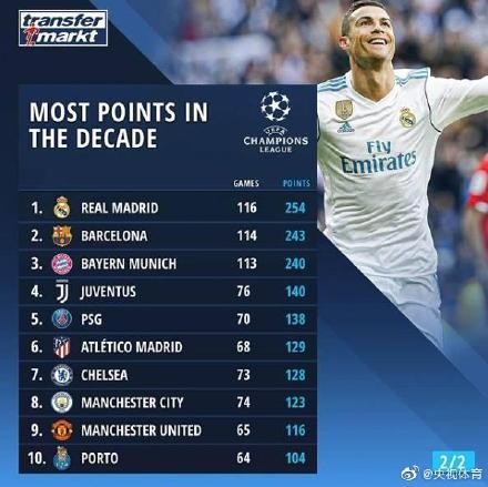 欧冠近十年总积分榜:皇马、巴萨、拜仁占据前三