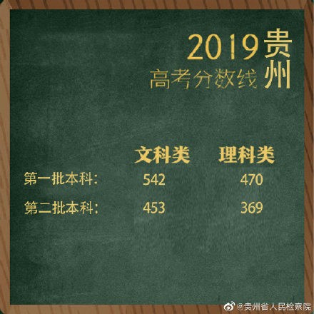 【2019年贵州高考分数线出炉】6月24日上午,2019年贵州高考分数线出炉:第一批本科理工类470分,文史类542分;第二批本科理工类369分,文史类453分;高职(专科)理工类180分,文史类180分。今年我省实行网上填报志愿