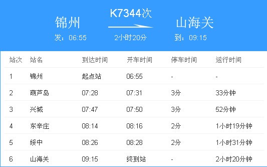 K7343次下午14点30分从山海关站始发,沿途停靠绥中、兴城、葫芦岛,下午17点05分到达锦州。