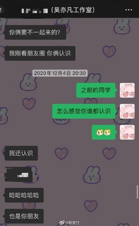 都美竹先前曾曝光对话纪录,透露是被吴亦凡工作室的人邀约去聚会。(图/翻摄自微博/都美竹)