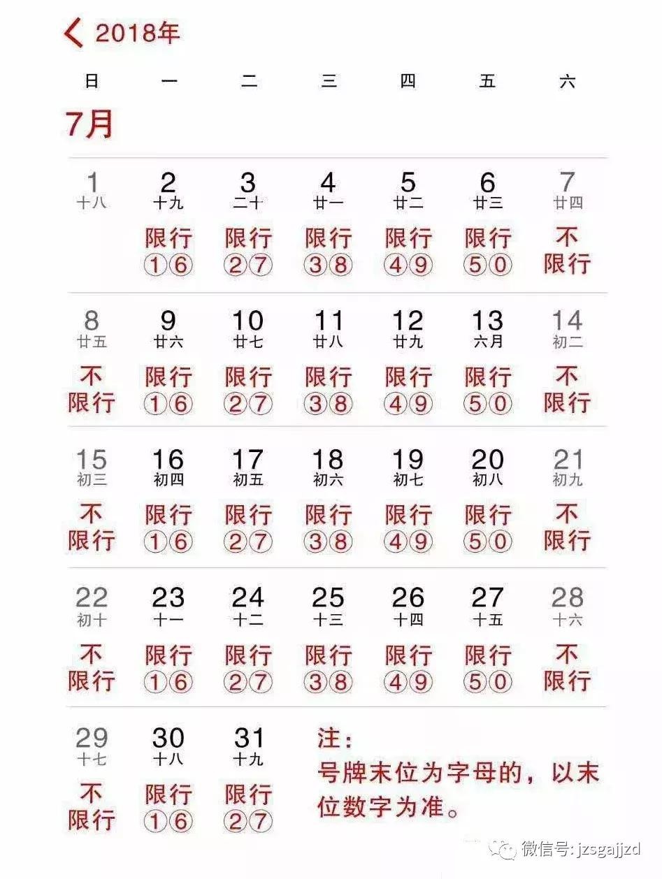 三、限行规定按照核发机动车号牌(含临时号牌)最后一位阿拉伯数字(号牌末位为字母的,以末位数字为准),工作日每天限行两个号,即:号牌最后一位阿拉伯数字为1和6的机动车周一限行、2和7的周二限行、3和8的周三限行、4和9的周四限行、5和0 的周五限行。因法定节假日放假调休而调整为工作日的周六、周日,按对应调休的工作日限行。
